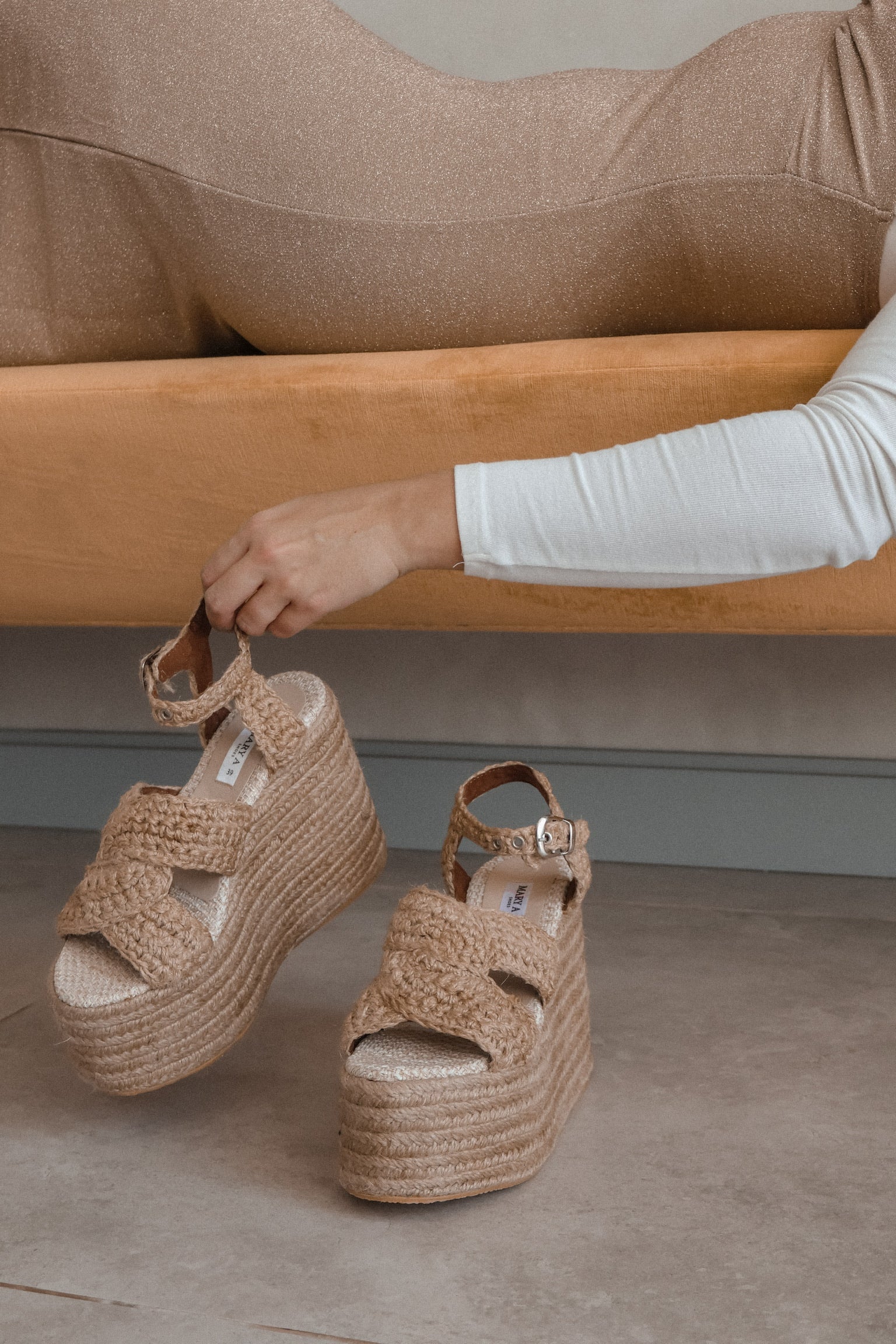 Plataforma hecha en madera forrada de yute. Altura 14 cms. Hebilla en acero inoxidable. Piezas hechas a mano por artesanos.